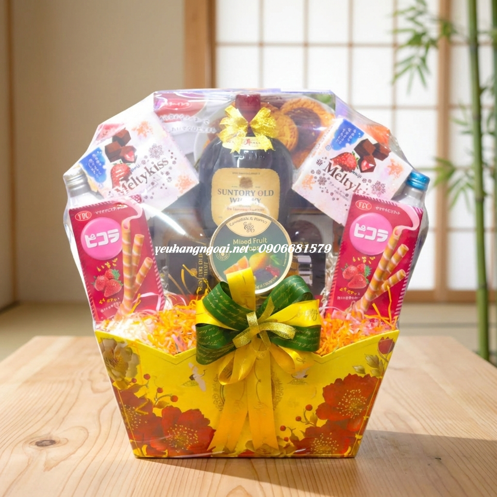Giỏ quà Tết Nhật Bản thường là tổ hợp quà tặng gồm các sản phẩm có nguồn gốc từ Nhật, được lựa chọn và sắp xếp theo phong cách:
