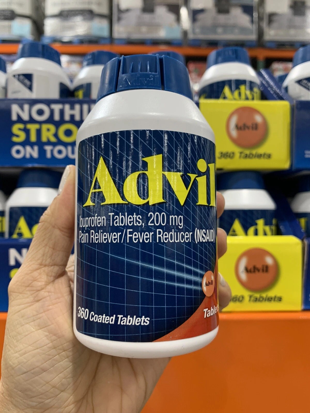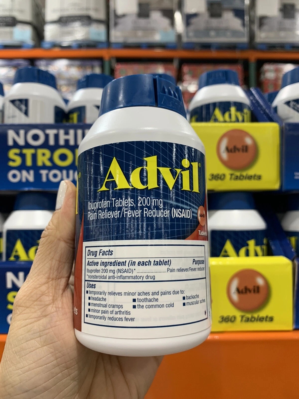 Advil Tablets 200mg là thuốc không kê đơn của Mỹ, chứa ibuprofen 200mg/viên, thuộc nhóm NSAID dùng để giảm đau tạm thời và hạ sốt. Phiên bản trong ảnh là chai 360 viên nén bao đường, phù hợp cho gia đình muốn dự trữ sẵn một sản phẩm giảm đau hạ sốt thông dụng để dùng khi cần.