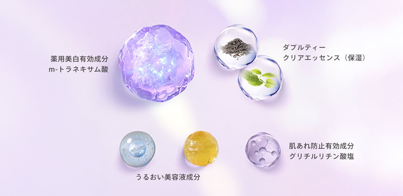 Hoạt chất dưỡng sáng được hãng nêu rõ là tranexamic acid, với cơ chế ức chế hình thành melanin để ngăn ngừa đốm nâu, tàn nhang. Bên cạnh đó là glycyrrhizinate giúp hỗ trợ chăm sóc da khi da dễ khó chịu hoặc dễ kích ứng. Công thức còn có Double Tea Clear Essence gồm chiết xuất trà, chiết xuất trà đen và glycerin để tăng cảm giác dưỡng ẩm.