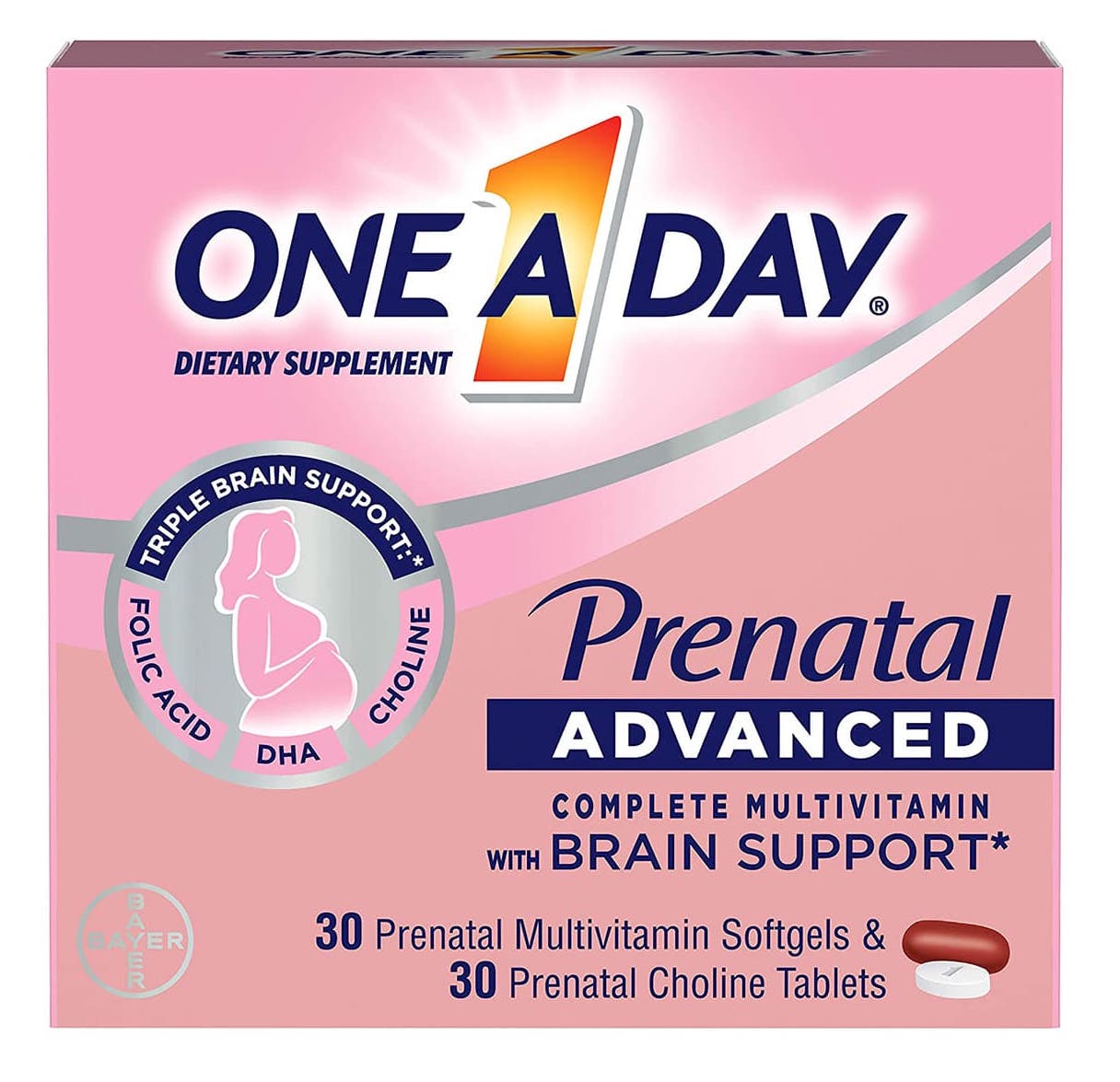 Vitamin cho bà bầu One A Day Prenatal Advanced bao gồm toàn bộ các vitamin hoàn hảo dành cho phụ nữ đang mang thai cũng như các chất dinh dưỡng cần thiết và quan trọng cho sự phát triển thể chất, trí não: Acid Folic, DHA, Choline và Sắt. Tất cả các chất đó có trong 1 hộp Prenatal One a Day với 30 Prenatal Multivitamin Softgels và 30 Prenatal Choline Tablets vô cùng tiện lợi.