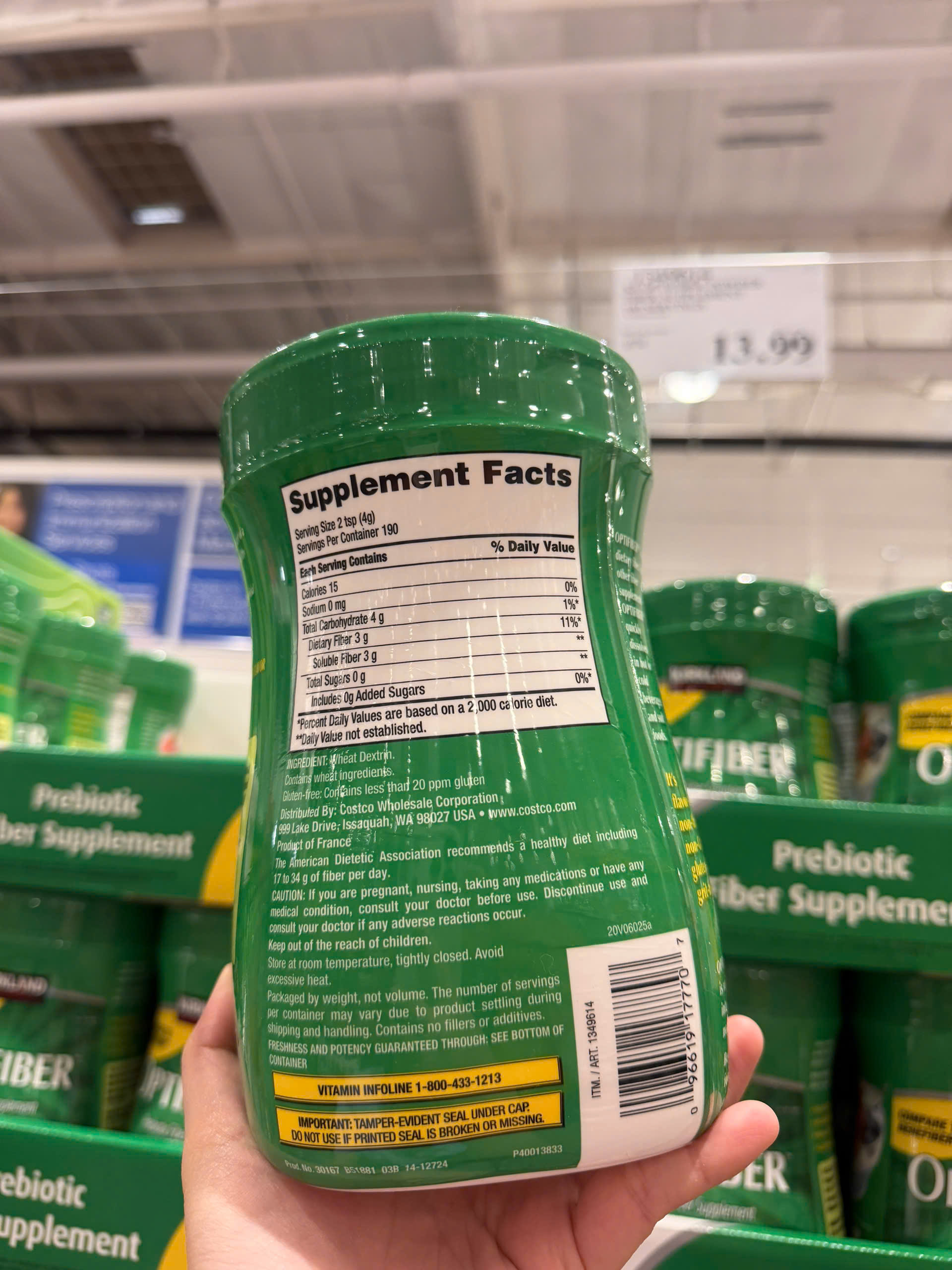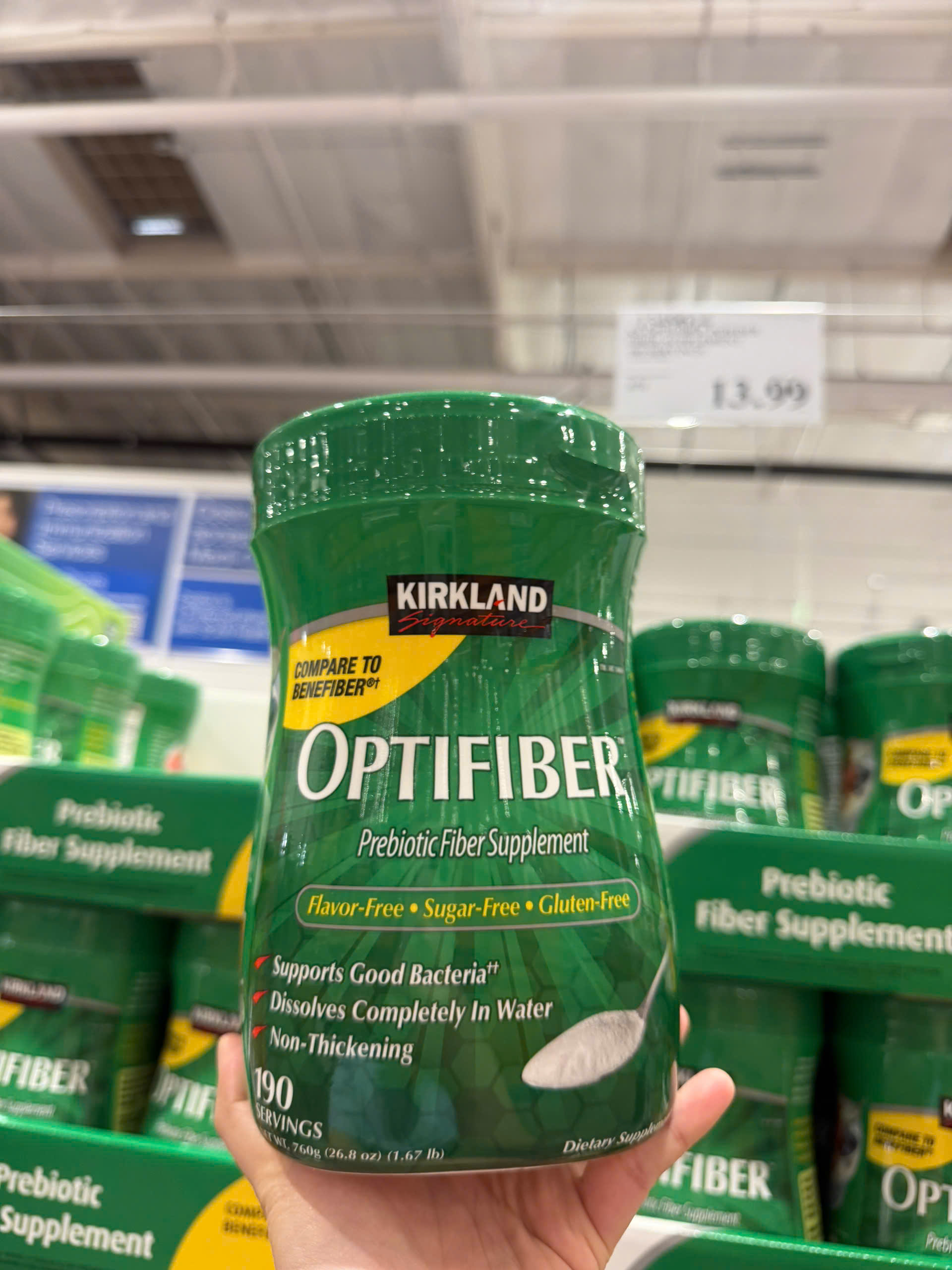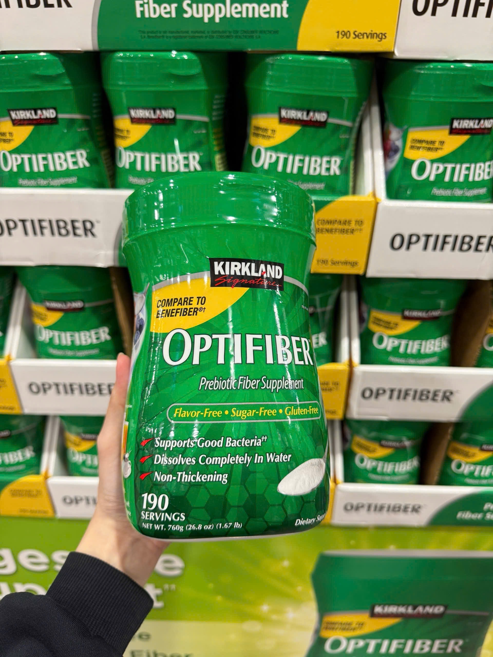 Nếu chế độ ăn hằng ngày của bạn còn thiếu chất xơ, hay ăn ngoài, ít rau xanh hoặc muốn bổ sung chất xơ theo cách tiện hơn, Kirkland Signature Optifiber là sản phẩm rất đáng tham khảo. Theo thông tin từ Costco, đây là prebiotic fiber supplement dạng bột, nổi bật với đặc điểm không mùi vị, không đường, không gluten, dễ hòa tan trong nước và không làm đặc sệt khi pha.