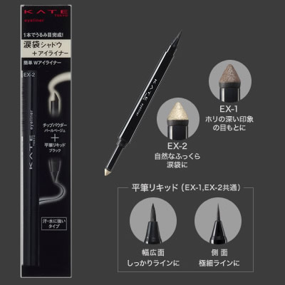 Bút kẻ mắt KATE kết hợp giữa kẻ mắt nước và phấn mắt 2 trong 1. EX-1: Bút kẻ mắt dạng lỏng màu đen với một bóng mắt màu nâu ở đầu bên kia và EX-2: Bút kẻ mắt dạng lỏng màu đen với một màu bóng mắt ngọc trai ở đầu bên kia.