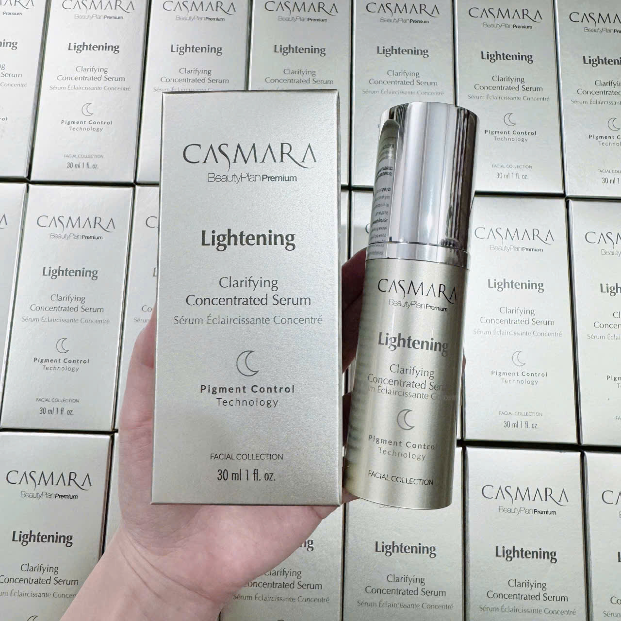 CASMARA Lightening Clarifying Concentrated Serum là serum dưỡng sáng dùng ban đêm thuộc dòng Lightening Collection của Casmara, phù hợp cho làn da xỉn màu, da không đều màu hoặc có vùng tăng sắc tố cần chăm sóc chuyên sâu. Theo mô tả chính thức từ hãng, đây là một chemical peel dùng ban đêm, hỗ trợ làm sáng da, làm mềm các vùng thâm sạm và giúp da trông đều màu, rạng rỡ hơn sau một thời gian sử dụng.