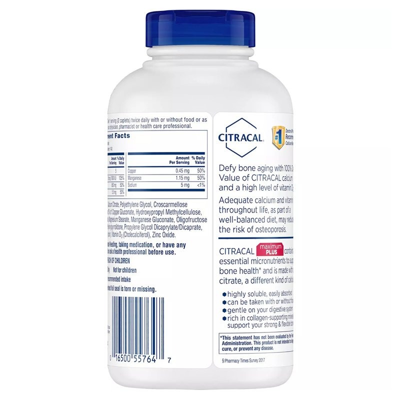 Citracal Maximum Plus Calcium Citrate + D3 là dòng bổ sung canxi cao cấp, sử dụng Calcium Citrate – dạng canxi được đánh giá cao về khả năng hấp thu – kết hợp cùng Vitamin D3 (Cholecalciferol) giúp hỗ trợ xương chắc khỏe và duy trì mật độ xương ổn định theo thời gian.