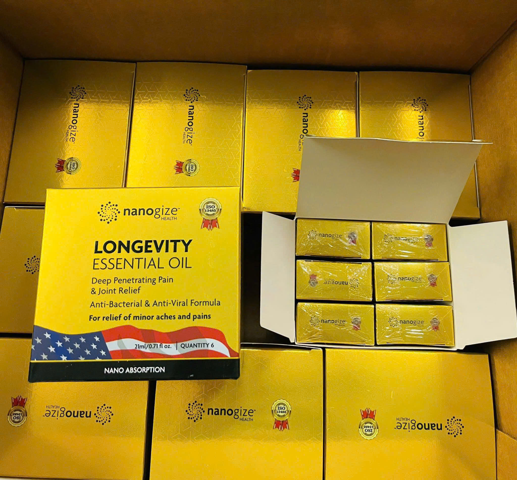Nếu bạn đang tìm một loại dầu xoa để dùng khi mỏi cơ, đau vai gáy, ê khớp hoặc cần xoa bóp thư giãn tại chỗ, Nanogize Longevity Essential Oil là dòng khá dễ gặp trên thị trường hàng Mỹ. Bản trong ảnh là hộp 6 chai, mỗi chai 21ml, và trên trang chính thức của hãng, sản phẩm được ghi là Made in USA.