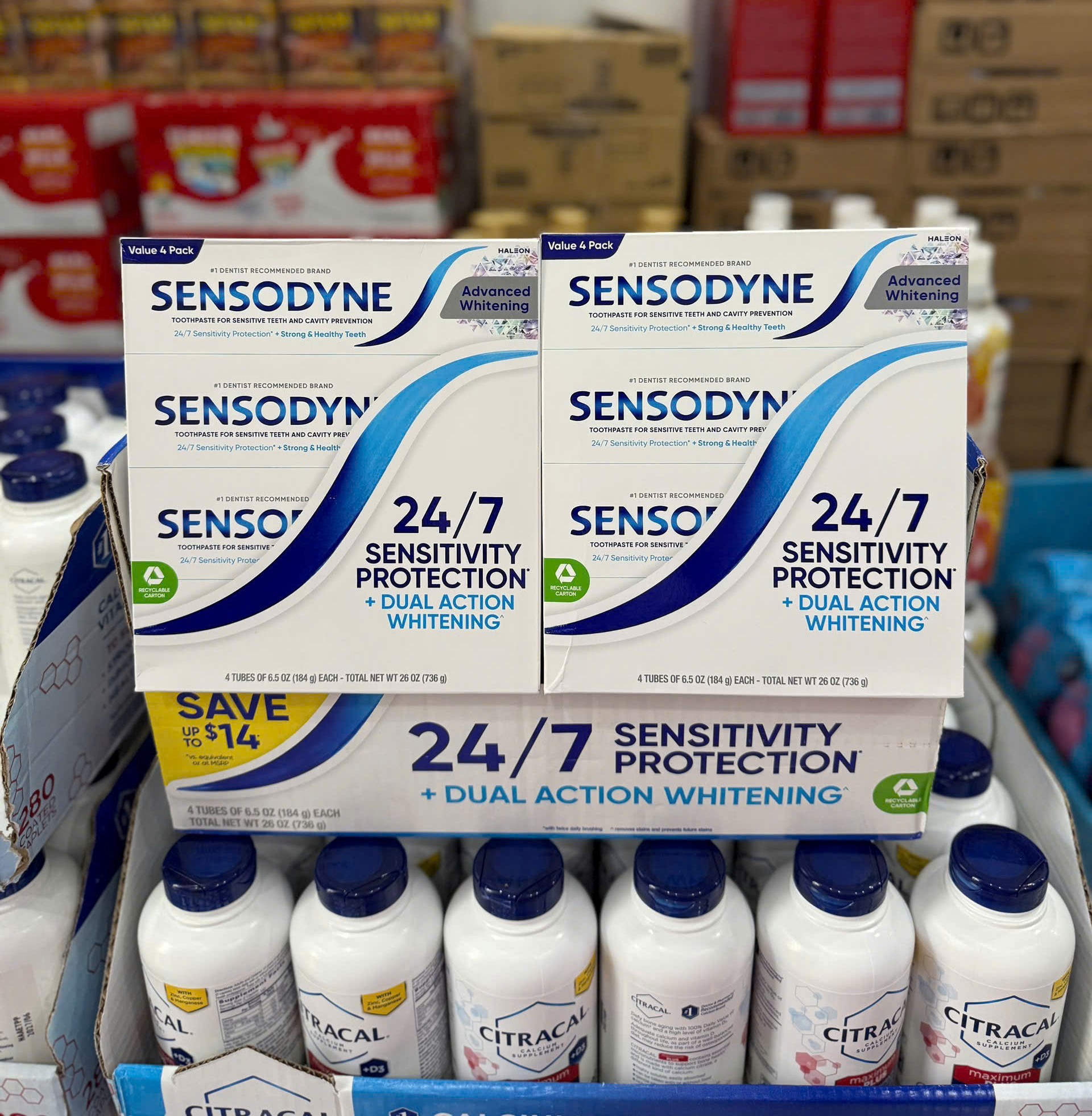 Nếu bạn đang tìm một dòng kem đánh răng vừa dùng hằng ngày, vừa chăm răng ê buốt, lại có thêm hướng làm trắng nhẹ nhàng, thì Sensodyne Advanced Whitening là lựa chọn khá dễ dùng. Bản trong ảnh là set 4 tuýp, mỗi tuýp 6.5 oz (184g), tổng 26 oz (736g). Trên bao bì và trang bán lẻ, sản phẩm được mô tả với các điểm chính như 24/7 sensitivity protection, advanced whitening action, removes & prevents stains và vị bạc hà dễ dùng hằng ngày.