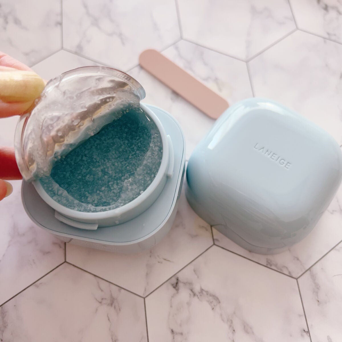 - Kem dưỡng ẩm Laneige Water Bank Blue Hyaluronic Cream Oily có thiết kế vô cùng đơn giản nhưng lại không kém phần độc đáo và đẹp mắt. Sản phẩm có thiết kế hình hộp vuông, tuy nhiên, điều làm nên sự khác biệt chính là các góc cạnh đều được bo tròn tinh tế tạo thành một khối vuông vững chắc nhưng lại mang nét “bụ bẫm” đáng yêu, không hề cứng nhắc và nhàm chán.