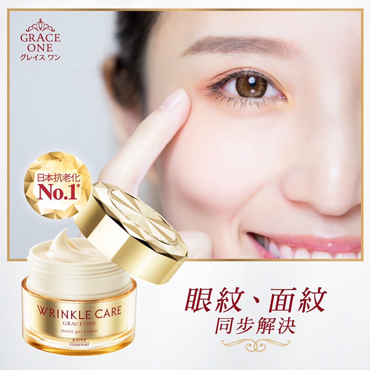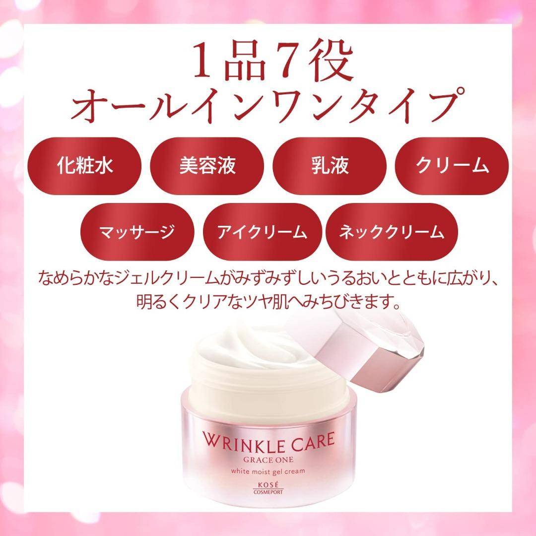 Kose Wrinkle Care Grace One có hiệu suất cao đã được chứng minh là cải thiện nếp nhăn với sự kết hợp của 7 công dụng trong 1 sản phẩm: lotion, tinh chất, nhũ tương, kem, massage, kem mắt, kem cổ.