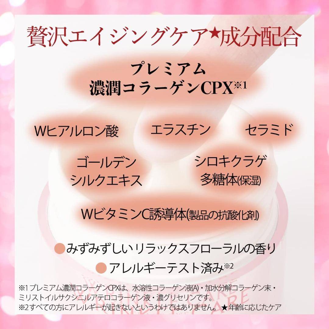 Niacinamide *, nước tinh khiết, glycerin đậm đặc, 1,3-butylene glycol, ethanol, cetyl 2-ethylhexanoate, este axit béo dipentaerythritol (1), phospholipid đậu nành hydro hóa, dầu hydro hóa, methylpoly Siloxane -tocopherol, tocopherol nicotinic acid ester, sodium hyaluronate (2), brielastine, chiết xuất sữa ong chúa, bột collagen thủy phân, chiết xuất men (1), dung dịch collagen hòa tan trong nước (A), Vitamin E tự nhiên, alkyl acryat disodium edetate, carboxyvinyl polymer, cholesterol, squalane, polyvinylpyrrolidone, macadamia nut acid béo phytosteryl, isoparaffin lỏng, natri hydroxit, axit ketone khan, phenoxyethanol, methylparaben, nước hoa.