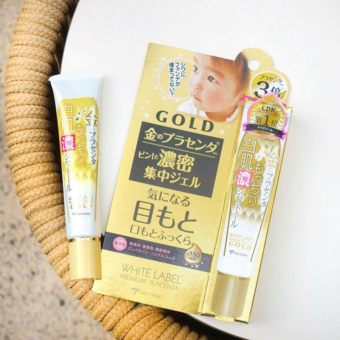 White Label Premium Placenta Rich Gold Eye Gel chuyên chăm sóc vùng mắt chứa lượng nhau thai và collagen đậm đặc gấp 3 lần so với sản phẩm thông thường, giúp giữ ẩm, cải thiện nếp nhăn, đánh tan quầng thâm mắt và chống chảy xệ da vùng dưới mắt. Các dưỡng chất placenta sẽ thấm sâu vào lớp biểu bì da loại bỏ các sắc tố đen sạm và hình thành, tái tạo các tế bào mới. Với công thức tập trung làm mềm da, vùng mắt trở nên mềm mịn ngay sau khi sử dụng.