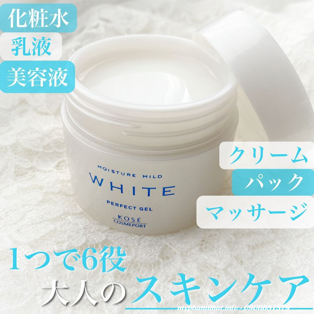 Kem dưỡng trắng da Kose White Moisture Mild Perfect Gel với 6 công dụng trong 1: Nước hoa hồng, sữa dưỡng, essence, kem dưỡng, mặt nạ, kem massage chứa hàm lượng vitamin C cao có khả năng thẩm thấu sâu vào da, tác động nhẹ nhàng giúp đánh bật sạm nám, đốm nâu, tàn nhang từ bên trong,làm sáng vùng da tối màu, làm mờ đốm nâu, dưỡng da sáng trắng hoàn hảo.