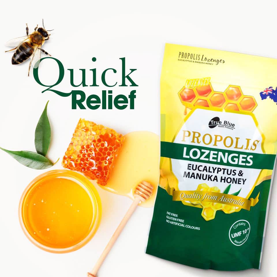 Thời tiết thay đổi thất thường rất dễ làm bạn bị cảm, viêm họng. Kẹo ngậm keo ong True Blue Propolis Lozenges Eucalyptus & Manuka Honey từ keo ong, mật ong và bạch đàn an toàn cho cả mẹ bầu và bé. Hơn nữa bé nào ho với đau họng mà không thích uống dạng viên hay siro thì kẹo ngậm ho True Blue Propolis Lozenges này hỗ trợ bé giảm cơn ho, ngứa cổ và kháng viêm hiệu quả.