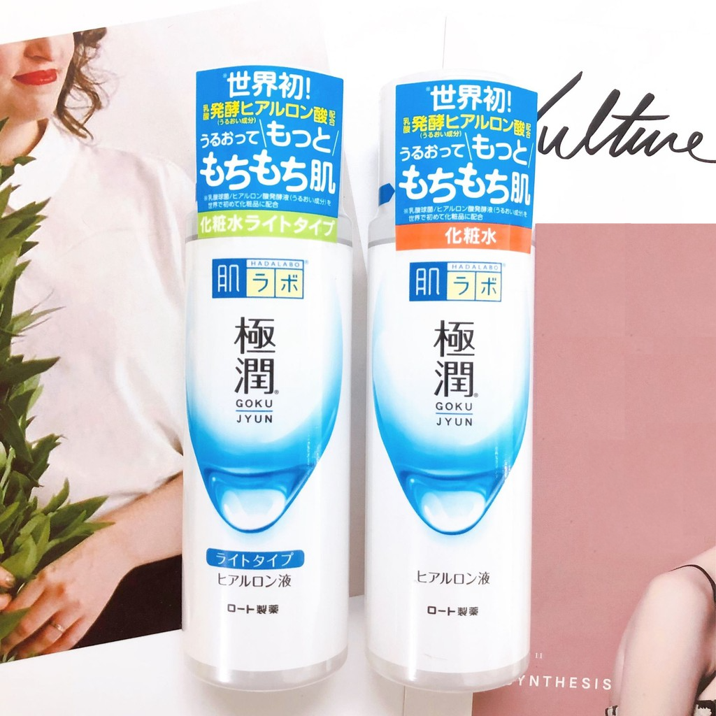 1 – Hada Labo Gokujyun Super Hyaluronic Acid lotion – Thân trắng sọc xanh lá/đỏ: Dưỡng ẩm, giúp làm mịn da