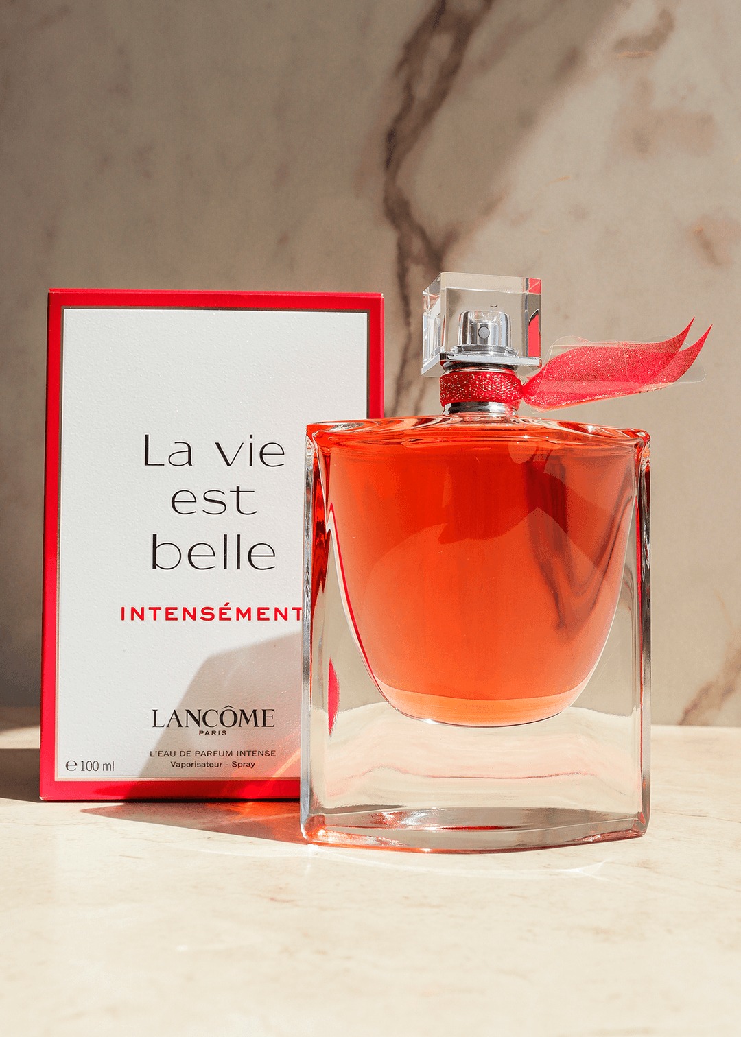 Thiết kế La Vie Est Belle Intensément EDP Intense cực kì bắt mắt với chủ đạo màu hồng đậm nữ tính, phụ kiện đi kèm là chiếc ruy bang màu xám thanh lịch tượng trưng một cô gái với chiếc khăn lụa thời trang.
