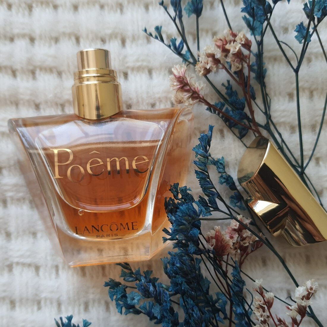 Nước hoa Lancome Poeme được mệnh danh là một tuyệt tác giàu chất thơ trong thế giới nước hoa, sự hòa quyện tương phản của đắng và ngọt lan tỏa ánh hào quang rạng ngời gợi cảm. Được gọi với cái tên kiều diễm – Nàng thơ của thời đại, Poeme điểm xuyến những bông hoa trắng và vàng, giữa cổ điển và hiện đại, tổng hòa nên mùi hương rất khác biệt, dễ dàng nhận biết giữa muôn vàn mùi hương đan xen. Hương cà dược e ấp nép mình với hương anh túc, hòa quyện cùng hương nhài nồng nàn sẽ làm rạo rực những con tim cuồng mùi hương.