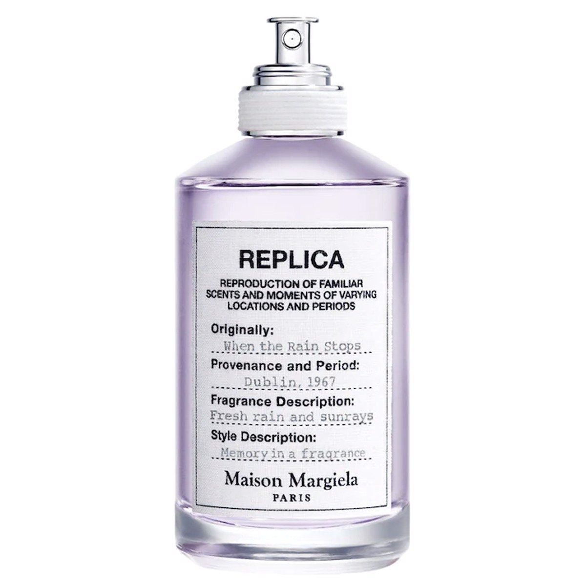 Nước hoa Replica When The Rain Stops là mùi hương mới, được hãng Maison Margiela ra mắt vào năm 2021, góp mặt vào bộ sưu tập nổi tiếng Replica. Nắm bắt tinh túy của niềm hân hoan sau những cơn mưa, thiết kế thắp sáng lên những tia nắng hy vọng, đưa người dùng đến trải nghiệm ngọt ngào khi bầu trời dần bình yên. Chai nước hoa vẫn trung thành với phong cách cổ điển. Hương thơm được cất giữ trong lòng chiếc lọ thủy tinh trong suốt. Trên thân chai có nhãn đính kèm thông tin sản phẩm. Đồng thời, phông chữ được sử dụng trên đó làm ta liên tưởng đến những bức thư điện tử của thập niên 90.