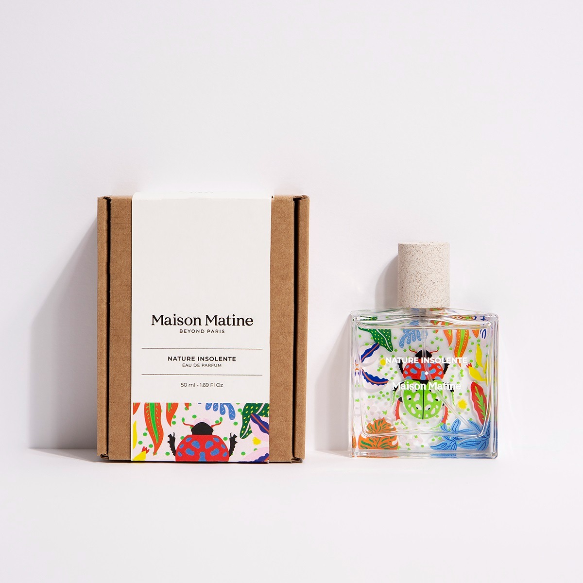 Thiết kế của Nature Insolente vẫn mang đậm tinh thần của Maison Matine với phần thân chai trong suốt và nhiều hoạ tiết sinh động với gam màu sắc bắt mắt, ấn tượng. Hình ảnh chú bọ cánh cứng để biến tấu với vô vàn màu sắc khác nhau chính là điểm nhấn trong thiết kế của dòng nước hoa này.