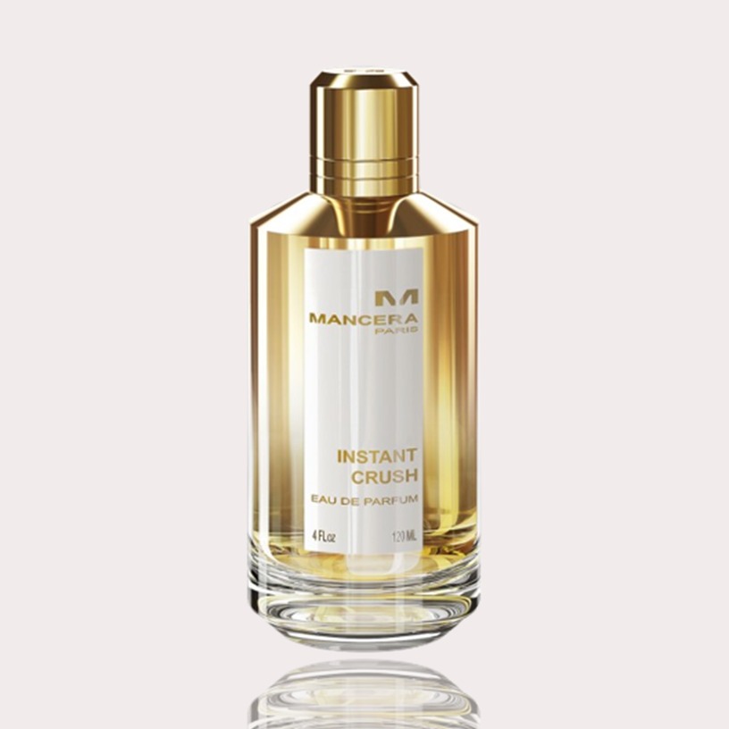 Nước hoa unisex Mancera Instant Crush có khả năng gây nghiện từ lần xịt đầu tiên, hương thơm lịch lãm, cân đối của hỗn hợp nghệ tây quý giá, cam quýt dễ chịu cùng gừng ấm áp. Tầng hương như chuốc say cảm xúc, làm đối phương được bồng bềnh trôi giữa tiếng nhạc jazz lãng đãng. Lớp hương trái tim với sự hòa trộn mịn màng của hoắc hương nồng nàn, nhài thanh khiết, hoa hồng quyến rũ. Tất cả gợi lên cả khu vườn xuân lấp lánh, một lần nữa làm ta không thể rời bỏ cơn mê này. Con tim bất lực đành để hương thơm dẫn dụ đến khu vườn địa đàng. Cuối cùng, gỗ đàn hương, vanilla, rêu sồi và xạ hương. Tổng thể tạo nên một Instant Crush hoàn chỉnh. Mang một hương thơm mới mẽ, có độ lưu hương lâu, và độ tỏa hương khá tốt, tạo thêm sự phong phú cho bộ sưu tập nước hoa của nhà Mancera.