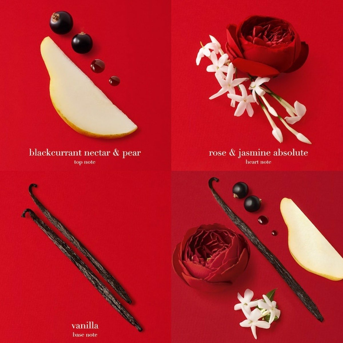 - Hương giữa: Hoa hồng, Hoa nhài, Quả dứa, Hoa vòi voi