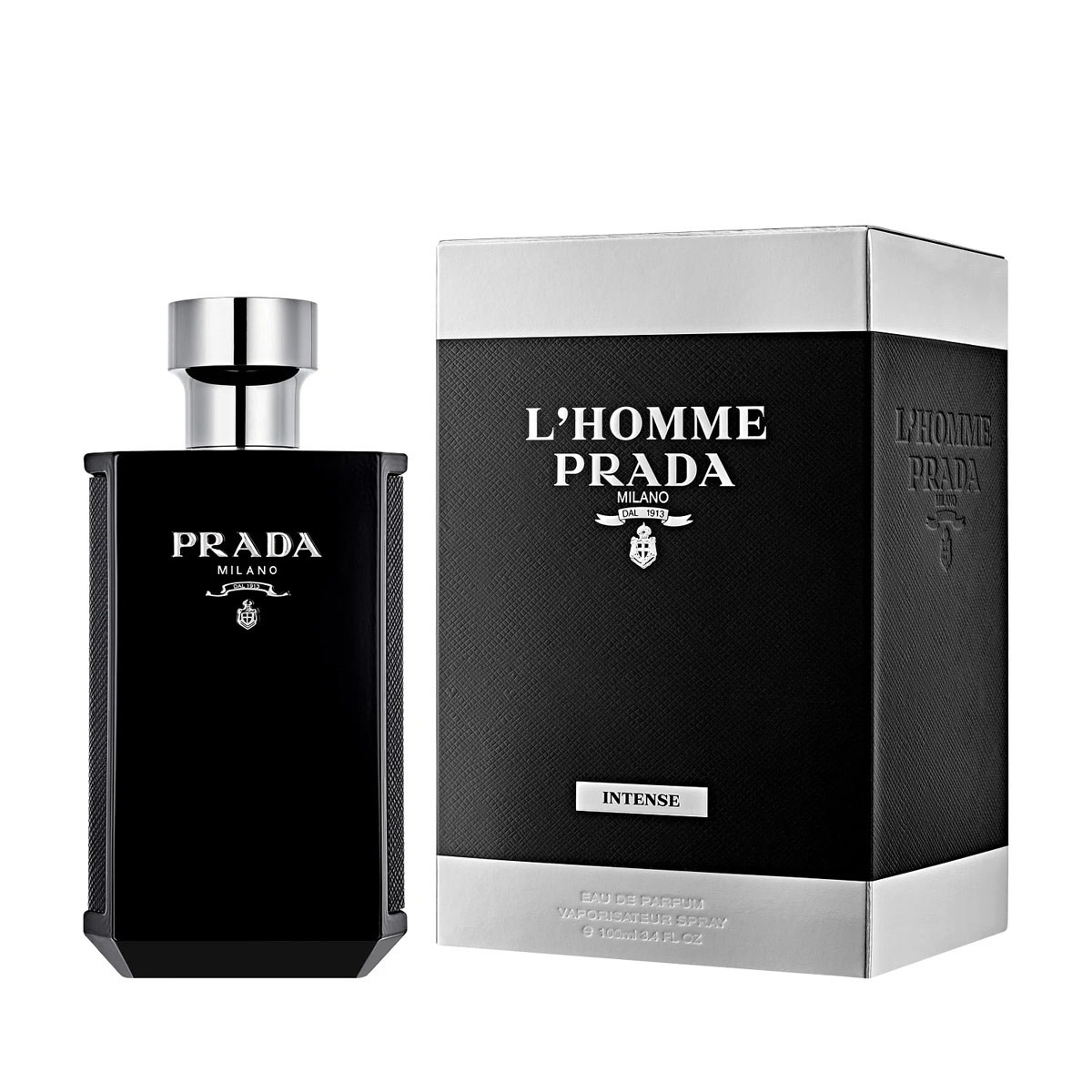 Prada L’Homme Intense có thiết kế chai bằng Saffiano màu đen, tạo ra hiệu ứng mờ đục tổng thể gợi lên bản chất khó nắm bắt của người đàn ông Prada đa diện.