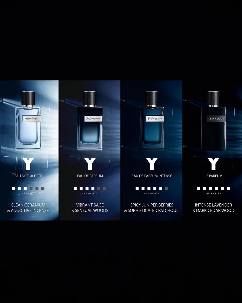 Bên cạnh mùi hương nam tính mang tính biểu tượng của dòng Y, phiên bản nước hoa Yves Saint Laurent Y EDP Intense năm nay đã mang đến nhiều sự đổi mới trong các note hương. Sự ngọt dịu, nhẹ nhàng đến từ những quả táo đã bị loại bỏ ra khỏi tần hương đầu tiên để lại sự cay the, ấm nóng của Gừng và Cam Bergamot. Bên cạnh hương thơm của Cây xô thơm, Quả bách xù ở tầng hương giữa thì phiên bản mới này còn điểm thêm nét hương sắc sảo đến từ Oải hương. Yves Saint Laurent Y EDP Intense đã kết lại với note hương đầy gợi cảm và quyến rũ đến từ Hổ phách, Đậu Tonka, Gỗ tuyết tùng, Cỏ Vetiver và Olibanum.
