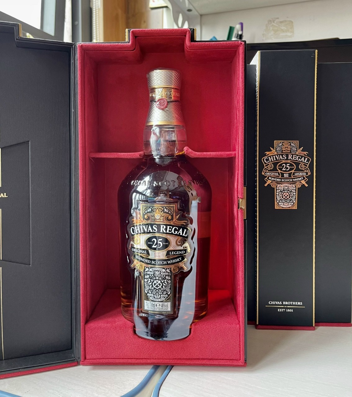 Rượu Chivas 25 Năm với sự pha trộn bởi những thùng whisky mạch nha lâu năm, với hương vị êm dịu, nhẹ nhàng nơi đầu lươi, dư âm hương hoa thanh lịch kéo dài đã làm say đắm biết bao dân sành rượu. Thưởng thức 1 ly Chivas Regal 25 sẽ đem đến nhiều cảm xúc thú vị cho người dùng.