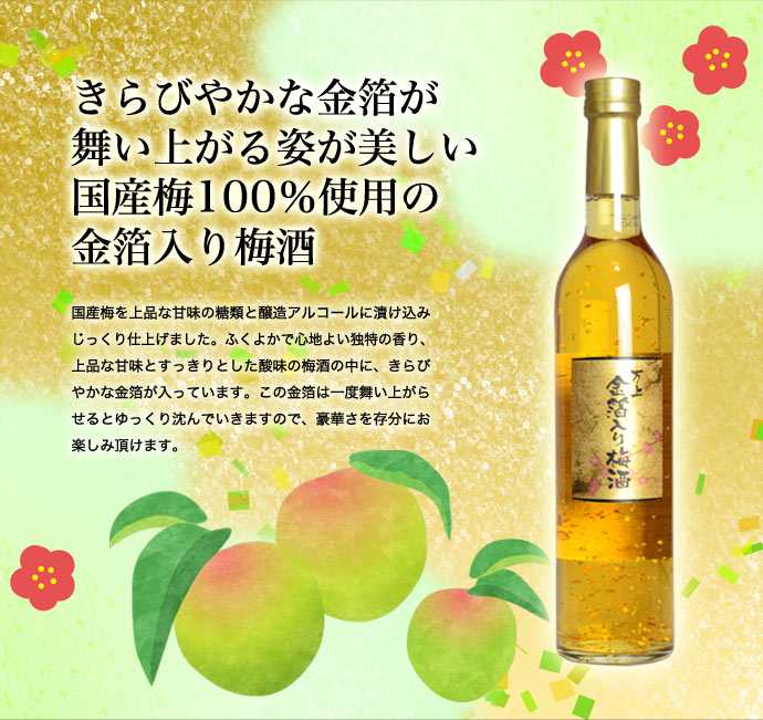 Rượu được làm theo phong cách umeshu Nhật Bản cổ điển, sử dụng trái mơ (ume) ngâm cùng rượu nền và đường theo tỉ lệ cân bằng. Sau quá trình ủ, vảy vàng mỏng được bổ sung để tạo điểm nhấn cao cấp, thường thấy trong các sản phẩm dùng làm quà tặng tại Nhật.