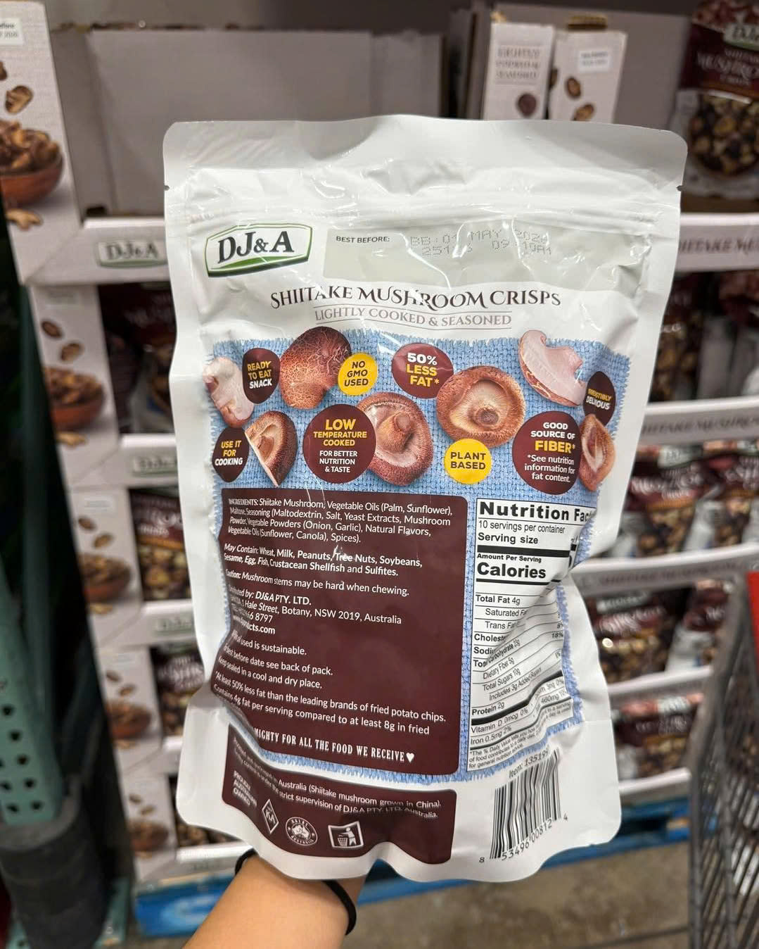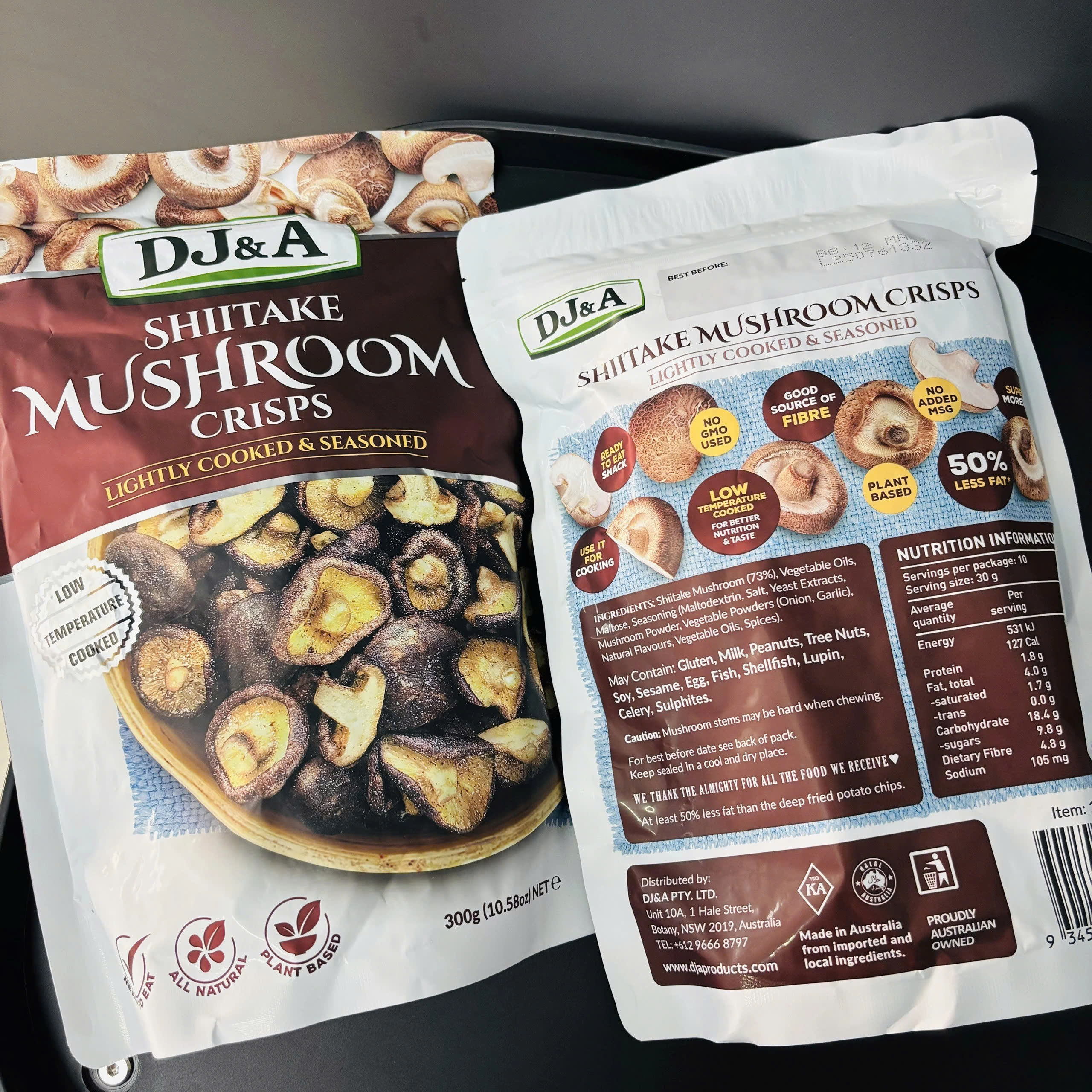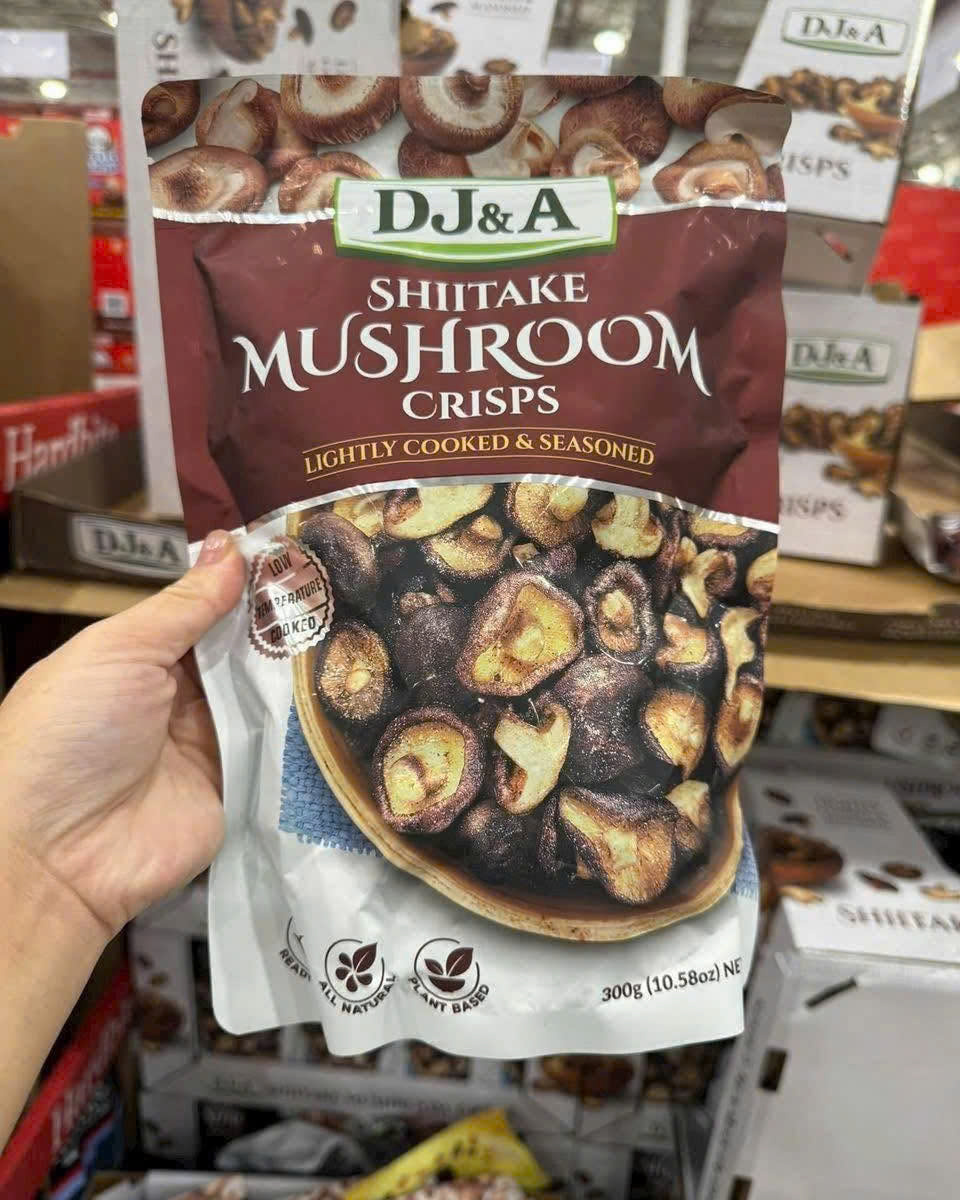 DJ&A Shiitake Mushroom Crisps là dòng snack nấm hương sấy giòn đến từ Úc, được chế biến nhẹ và nêm nếm vừa phải để giữ trọn hương vị tự nhiên của nấm. Sản phẩm phù hợp cho người tìm kiếm một lựa chọn ăn vặt thuần thực vật, ít ngấy, dễ ăn và không tạo cảm giác nặng bụng như các loại snack chiên dầu thông thường.