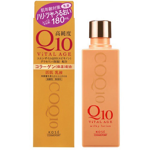 Sữa dưỡng ẩm chống lão hoá Kose Q10 Vital Age Milky Lotion của hãng mỹ phẩm Kose nổi tiếng hàng đầu Nhật Bản bổ sung Coenzyme Q10, collagen và glyceryn có tác dụng chống nhăn, chống lão hóa, dưỡng ẩm và kích thích tái tạo da mới vào ban đêm vô cùng hiệu quả.