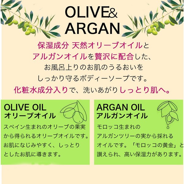 - Với thành phần chính chiết xuất từ bộ đôi dầu Olive & Argan giúp tăng cường dưỡng ẩm, dưỡng sáng da, duy trì độ đàn hồi trên da, mang đến làn da mềm mại, mịn màng sau khi tắm.