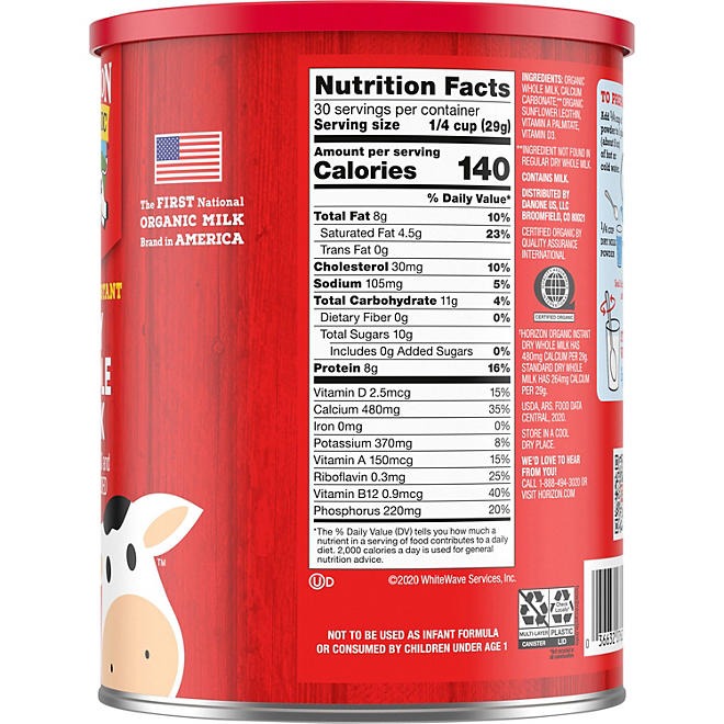 Sữa tươi nguyên kem hữu cơ dạng bột Horizon Organic Instant Dry Whole Milk – Thưởng thức hương vị tuyệt vời của sữa Horizon ở dạng bột tiện lợi với Sữa nguyên kem hữu cơ uống liền Horizon. Sữa nguyên kem dạng bột này cung cấp dinh dưỡng từ sữa thơm ngon cho cả trẻ em và người lớn. Nó được tăng cường Vitamin A và D và chứa nhiều canxi hơn 50% so với sữa nguyên chất khô tiêu chuẩn.