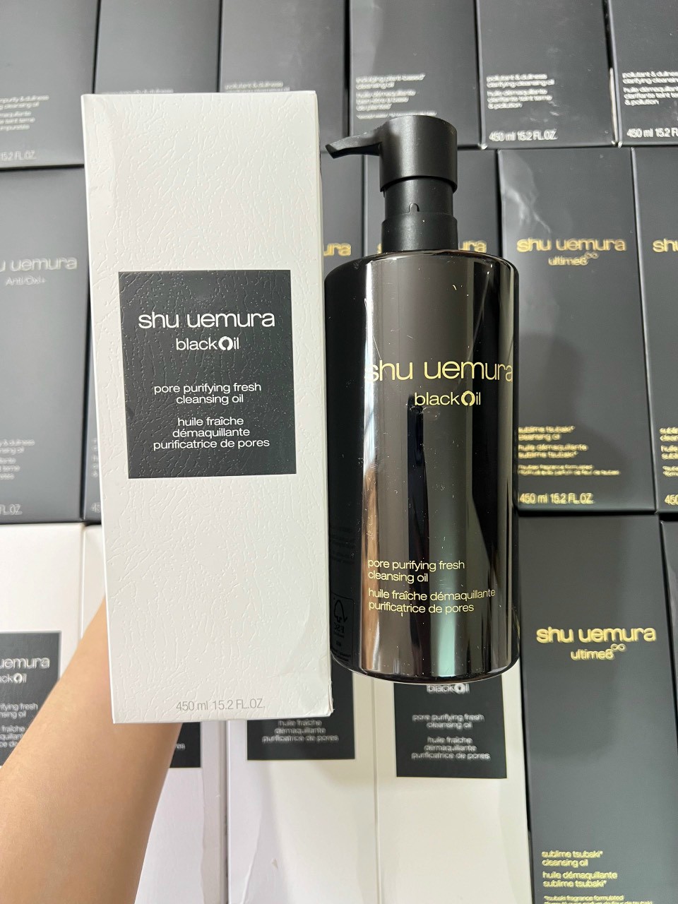 - SHU BLACK OIL (Shu đen) 450ml: Được thiết kế dành cho da dầu/da hỗn hợp, sản phẩm có kết cấu nhẹ, tươi mát này giúp làm sạch lỗ chân lông tức thì và mang lại sự tươi mát lâu dài. Dầu đen cao cấp, được pha trộn với than charcoal Nhật Bản cao cấp, giúp giảm tắc nghẽn lỗ chân lông với khả năng loại bỏ vượt trội lớp cặn trang điểm. Gạo đen quý giá được biết đến với nhiều acid amin hỗ trợ làn da được dưỡng ẩm khỏe mạnh, hoàn thành hành trình làm sạch