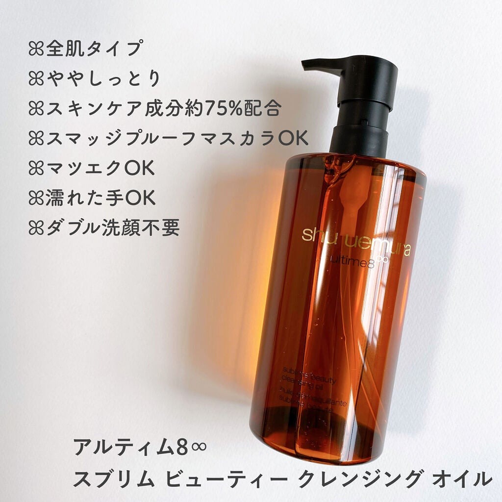 - Shu Uemura Ultime8 là loại dầu làm sạch tuyệt hảo cho những người có làn da khô, nhạy cảm. Thiết kế vòi nhấn cổ điển của Shu uemura rất tiện dụng, Ultime8 có cấu trúc dày và chỉ cần một lần nhấn cho toàn bộ khuôn mặt. Dùng rất tiết kiệm, không bị hao như tẩy trang dạng cream.