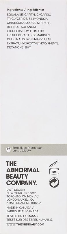 Squalane, Caprylic/Capric Triglyceride, Simmondsia Chinensis (Jojoba) Seed Oil, Retinol, Solanum Lycopersicum (Tomato) Fruit Extract, Rosmarinus Officinalis (Rosemary) Leaf Extract, Hydroxymethoxyphenyl Decanone, BHT.