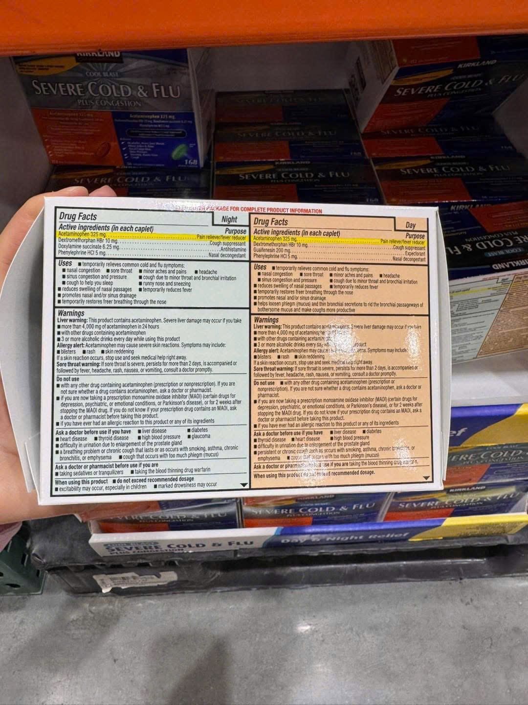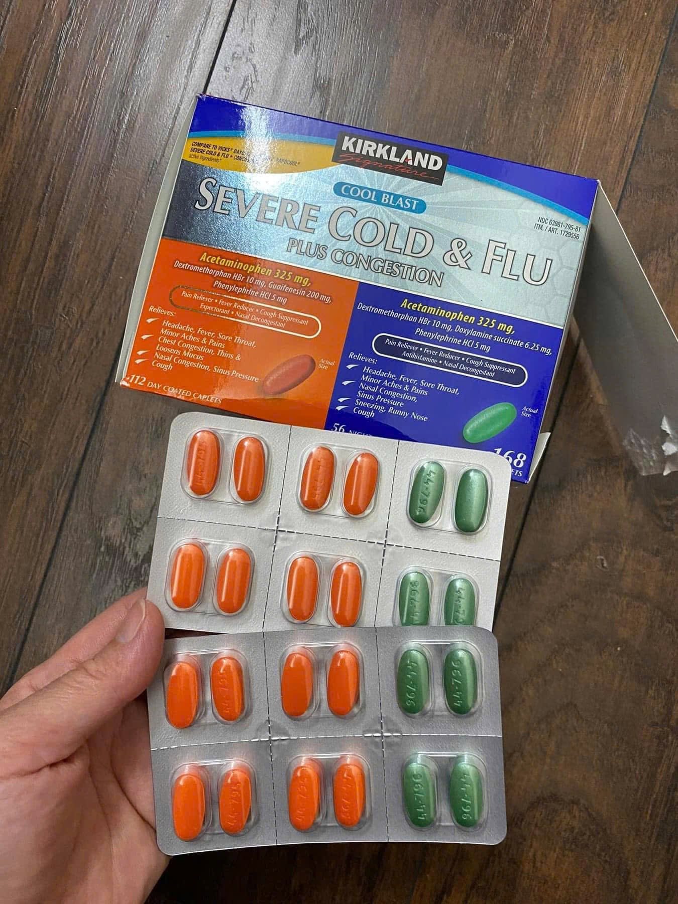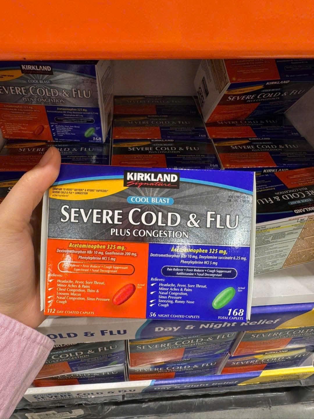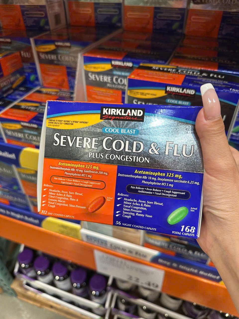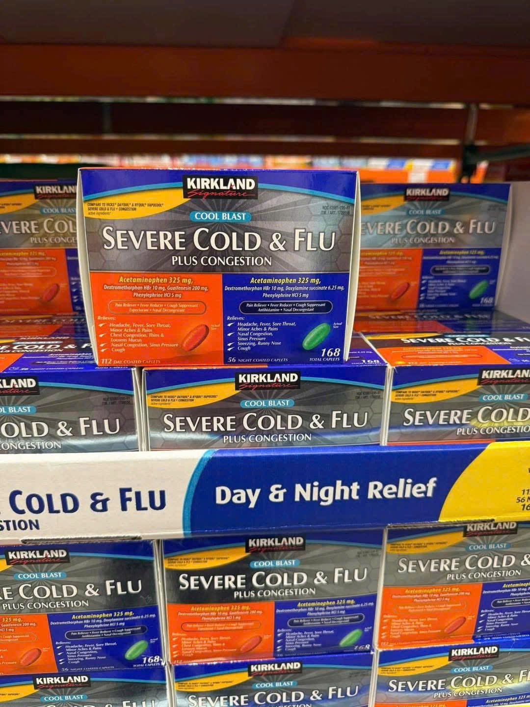 Nếu trong nhà muốn có sẵn một hộp thuốc cảm cúm kiểu “đủ bộ” để dùng khi bắt đầu đau họng, sốt nhẹ, nghẹt mũi, ho và nặng ngực, thì Kirkland Severe Cold & Flu Plus Congestion là dòng khá tiện. Bản trong ảnh là hộp day/night 168 viên, chia sẵn viên dùng ban ngày và ban đêm, đỡ phải mua nhiều loại riêng lẻ. Theo nhãn thuốc, công thức ban ngày và ban đêm đều hướng tới giảm các triệu chứng cảm lạnh, cảm cúm như nghẹt mũi, đau họng, đau đầu, đau nhức nhẹ, ho và sốt; trong đó bản ban ngày có thêm thành phần long đờm, còn bản ban đêm có thêm thành phần kháng histamine giúp dễ nghỉ hơn.