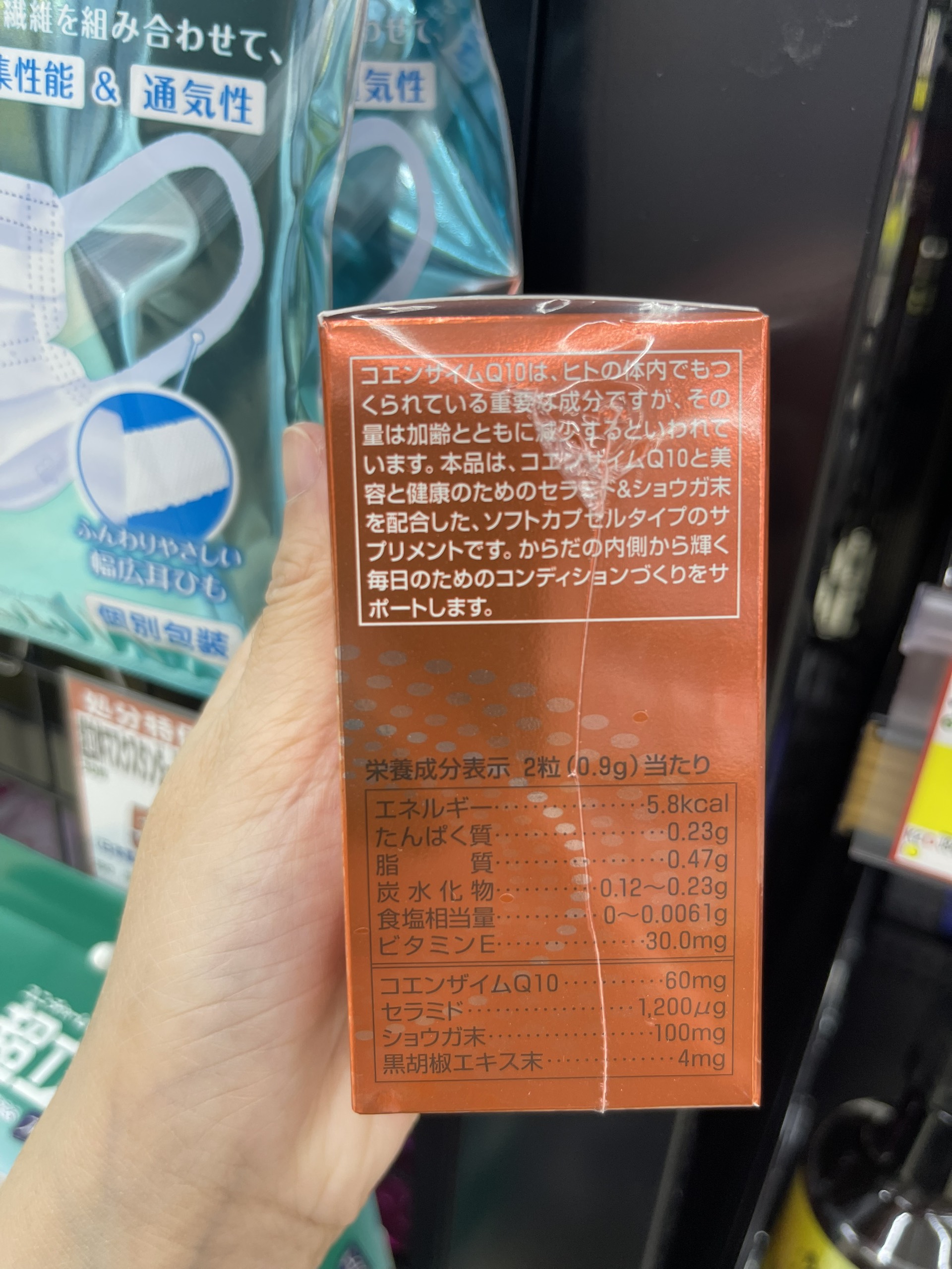 Olive oil, Ginger end, Coenzyme Q10, Vitamin E-containing vegetable oils, potato extract powder containing konjac ceramide, black pepper extract powder, gelatin, glycerin, beeswax, glycerol ester, caramel color