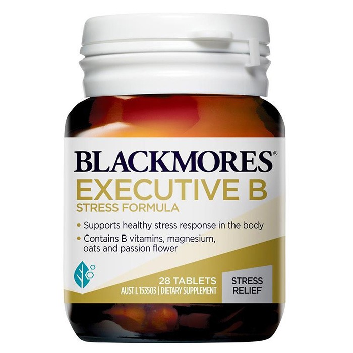 - Viên uống giảm stress Blackmores Executive B Stress Formula 28 viên được điều chế với thành phần các dưỡng chất, vitamin nhóm B, vitamin C và kẽm, magie, phốt pho rất cần thiết cho cơ thể khi bị stress, giúp duy trì sức khỏe và tinh thần tốt hơn. Tinh chất thảo mộc thư giãn thần kinh, giúp bạn cảm thấy bớt áp lực căng thẳng, và bình tĩnh hơn khi làm việc.
