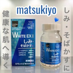 Matsukiyo White EX II 270 viên là thuốc OTC nhóm 3 của Nhật Bản, nổi bật với công thức chứa L-cysteine 240mg, vitamin C 1000mg, vitamin E 50mg cùng vitamin B2 và B6 trong liều dùng 6 viên/ngày. Theo thông tin từ nhà bán lẻ chính thức, sản phẩm được dùng để làm giảm nám, tàn nhang và tình trạng tăng sắc tố do cháy nắng hoặc kích ứng da, đồng thời bổ sung vitamin C cho cơ thể trong một số giai đoạn cần thiết. Dạng viên bao phim nhỏ giúp dễ uống và thuận tiện sử dụng hằng ngày.
