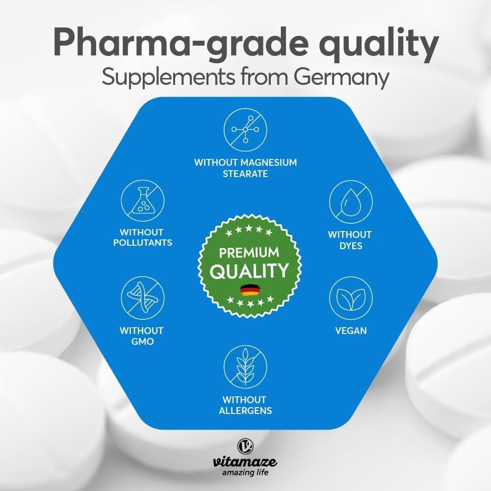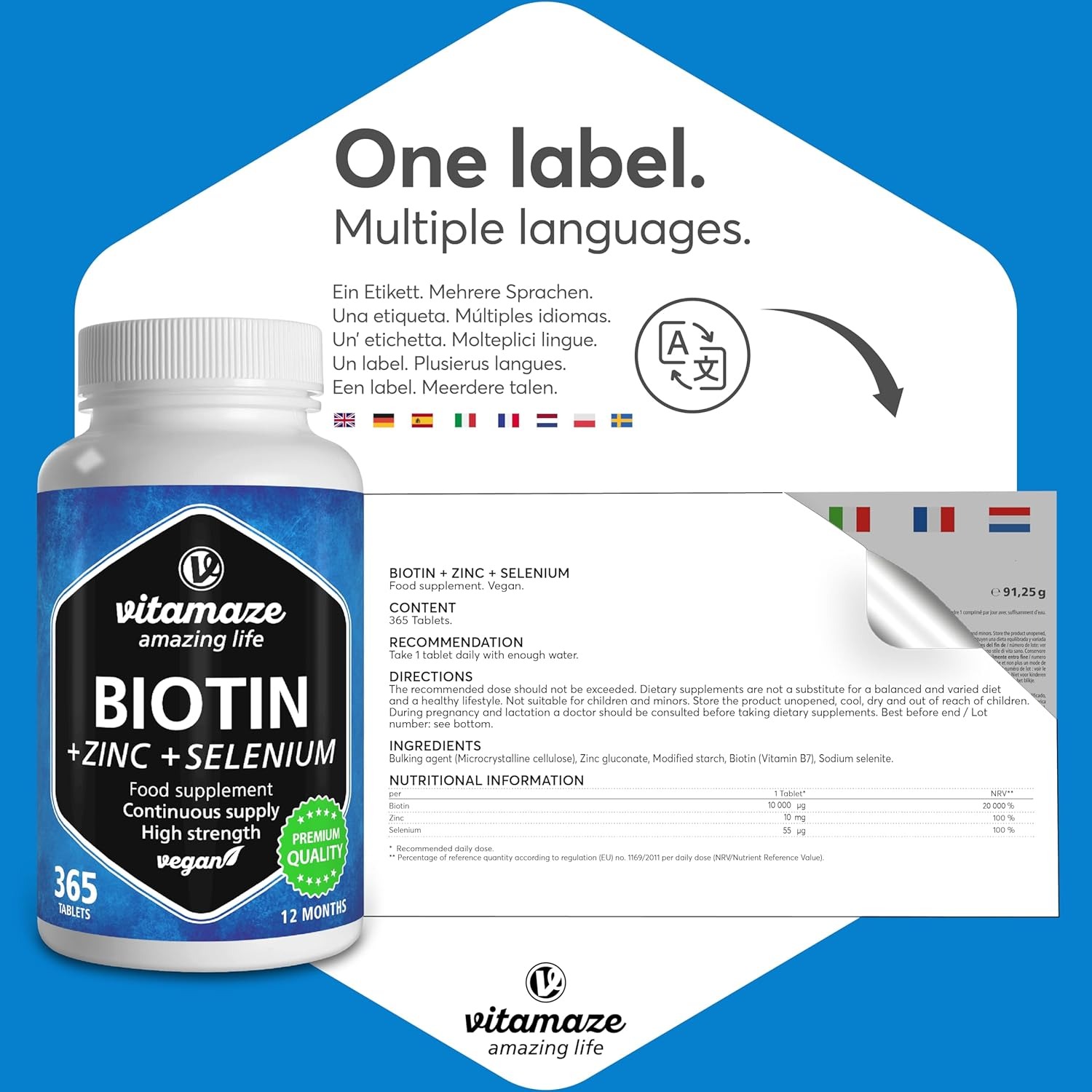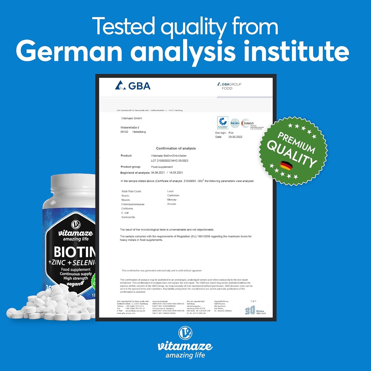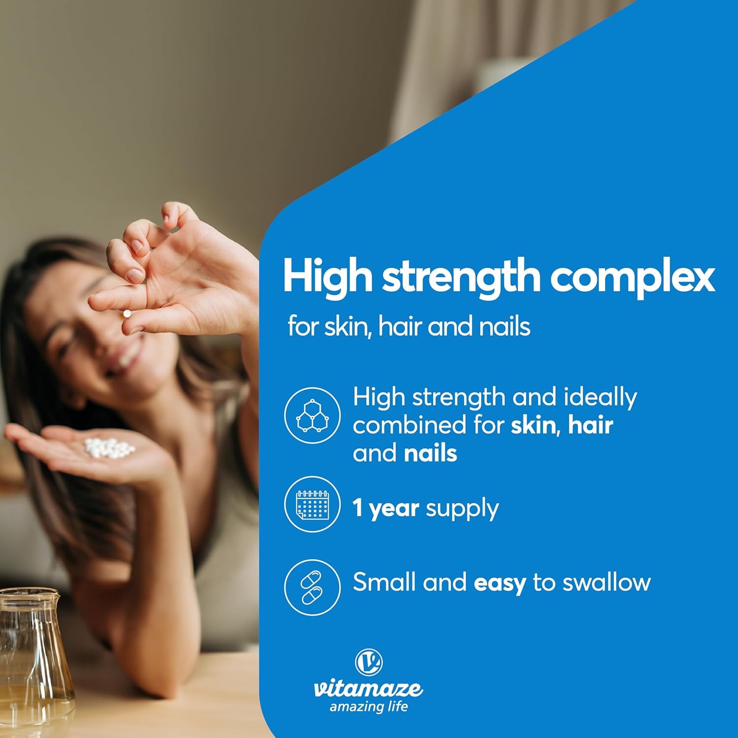 Viên uống mọc tóc Vitamaze BIOTIN + Zink + Selen chứa Biotin, Kẽm và Selen liều cao. Đây là các chất dinh dưỡng thiết yếu hỗ trợ sự tăng trưởng tự nhiên với giá trị tốt nhất, cùng nhau tạo nên sự kết hợp tuyệt vời cho làn da, sự phát triển của tóc và móng tay. Ngăn rụng tóc, kích thích mọc tóc, mang lại mái tóc dày, làn da và móng tay sáng hồng khỏe mạnh. Không chứa chất phụ gia, hạt nano và chất gây dị ứng. Thuần chay.