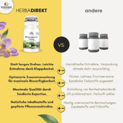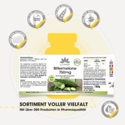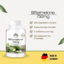 Viên uống Herbadirekt Bittermelone 750mg chiết xuất mướp đắng của hãng dược phẩm WARNKE Đức, giúp giảm tích tụ mỡ dư thừa, giảm hấp thụ đường trong máu, giảm cholesterol máu, nhờ đó hỗ trợ giảm cân, giảm đường huyết, hỗ trợ hệ miễn dịch cho một cơ thể khỏe mạnh và đẹp từ bên trong. Sản phẩm được sản xuất tại Đức và đạt tiêu chuẩn chất lượng HACCP. Không chứa gelatin, không chứa gluten, không chứa lactose, không chứa men, thuần chay.