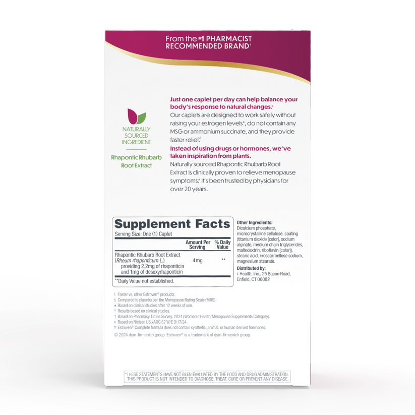Viên uống cân bằng nội tiết tố Estroven Complete Multi-Symptom Menopause Relief chứa chiết xuất rễ cây đại hoàng Rhapontic dựa trên thực vật đã được chứng minh lâm sàng (ERr 731), đã được các bác sĩ tin tưởng trong hơn 20 năm để làm giảm các triệu chứng mãn kinh, do tính an toàn và hiệu quả của nó.