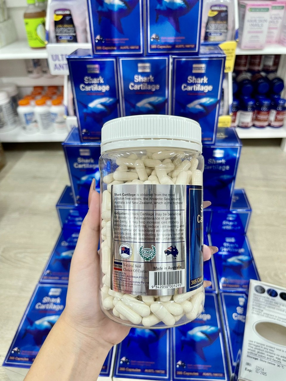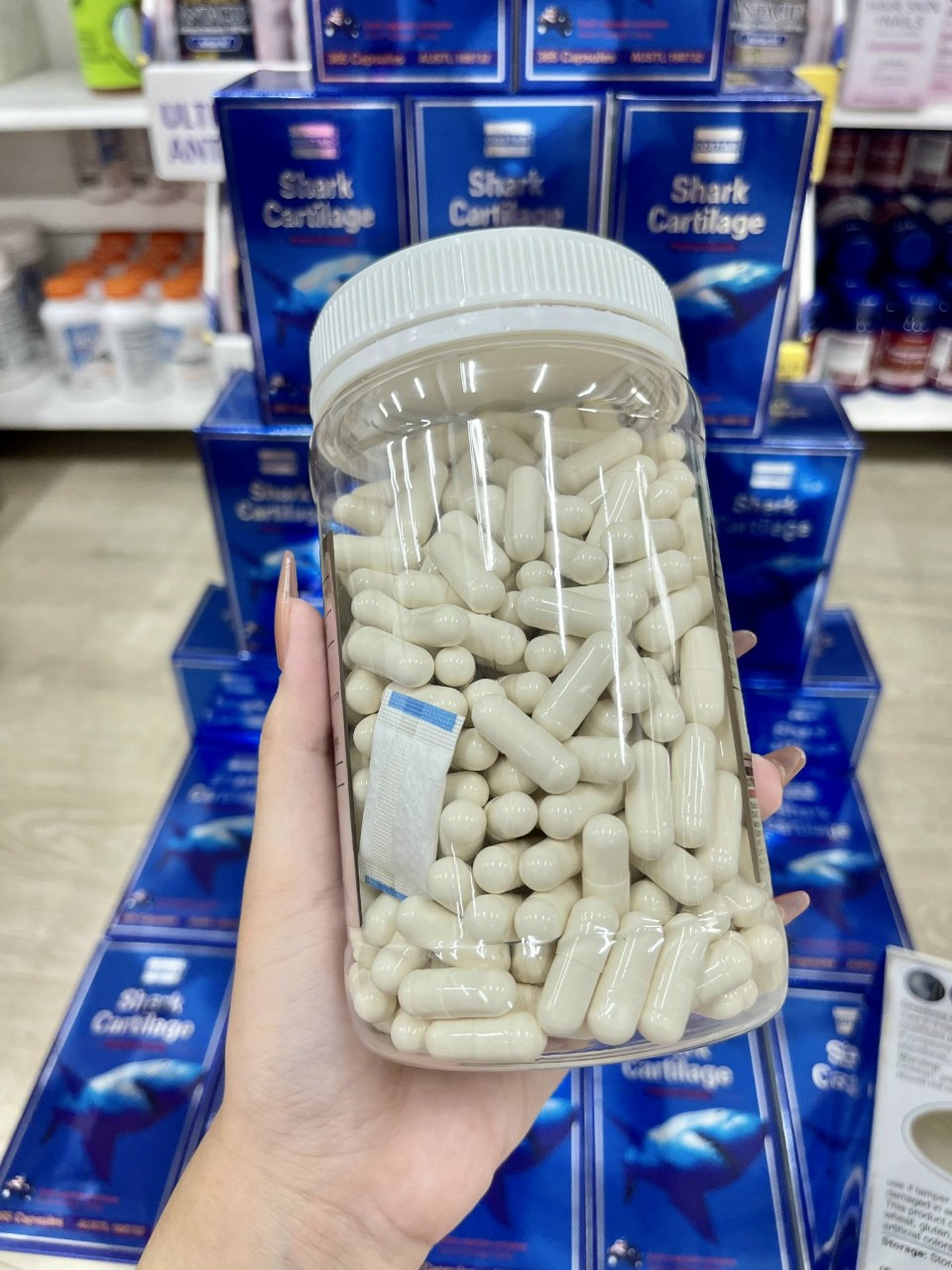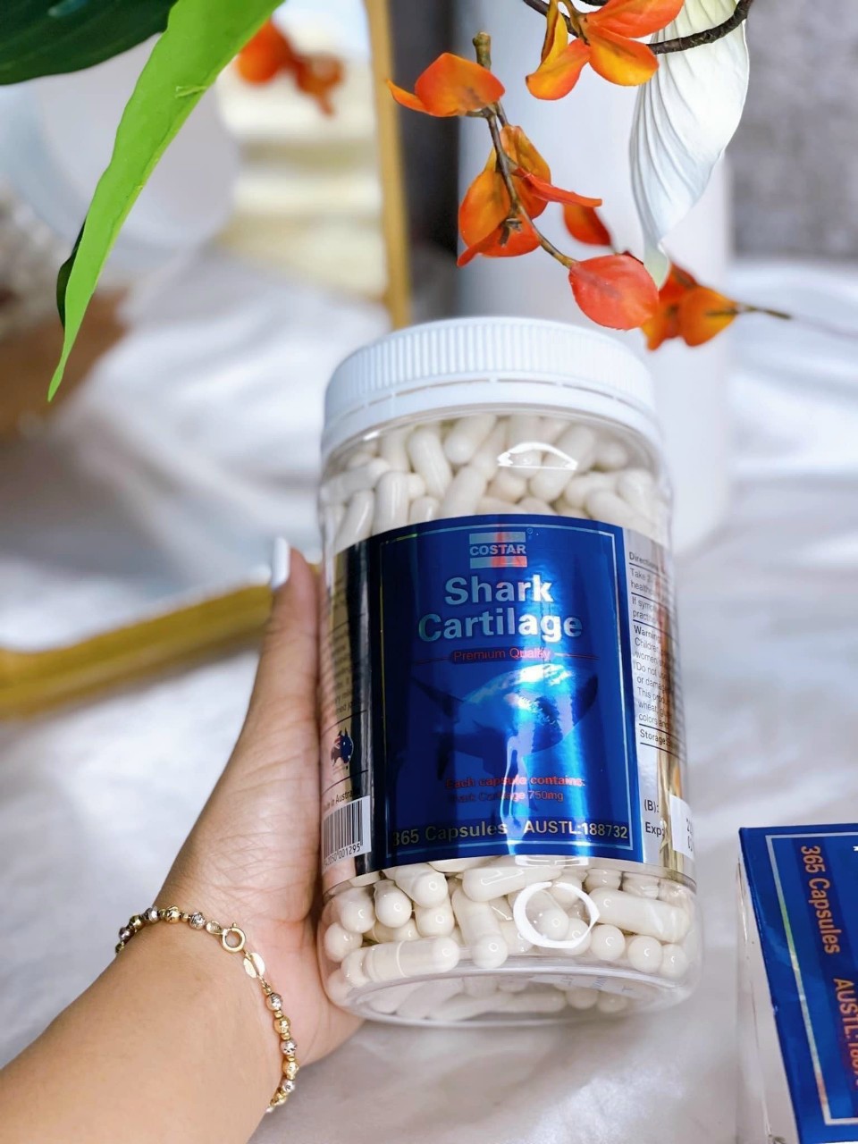 - Sụn vi cá mập Shark Cartilage được chiết xuất 100% bột đông khô sụn vi cá mập tinh khiết, nguồn cung cấp chondroitin và glycosaminoglycans (GAG’s) tự nhiên, gồm nhiều canxi, photpho, kẽm…, glucosamine, dầu gan cá mập,..