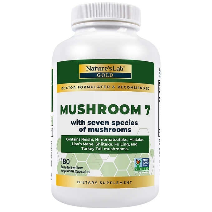 Nature’s Lab Mushroom 7 1,500 mg là sự pha trộn cao cấp của bảy loài nấm được trồng hữu cơ. Các loại nấm được lựa chọn cụ thể để bổ sung cho nhau trong việc hỗ trợ sức khỏe nói chung. Được làm bằng nấm hữu cơ, hỗn hợp hảo hạng này bao gồm các loài nấm linh chi Brazil, nấm linh chi, bờm sư tử, nấm maitake, linh chi, nấm hương và các loài đuôi gà tây. Giúp tăng sức khoẻ hệ miễn dịch và sức khoẻ chung cho cơ thể, phòng ngừa các bệnh cảm cúm, dị ứng hô hấp, bệnh do trái gió trở trời.