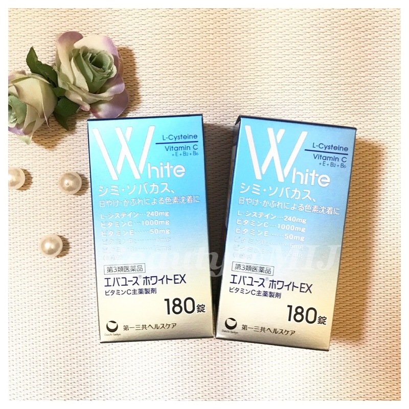 Viên uống trắng da White EX Nhật Bản với thành phần vitamin C+ L-cyseteine, vitamin E và vitamin B tác dụng cải thiện sắc tố da, làm sáng da, cải thiện da không đều màu, thâm nám do nội tiết tố thay đổi sau tuổi 30.