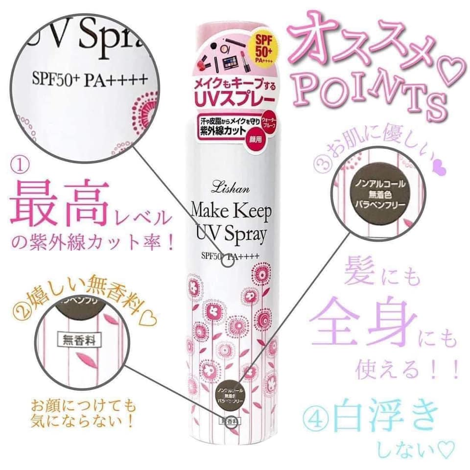 Xịt chống nắng Lishan UV Protection Spray SPF50+ PA++++ Nhật Bản Mùi hương dễ chịu và thiết kế dạng xịt với tia sương mịn nhẹ có khả năng thấm nhanh mà không hề nhờn rít, để lại vệt trắng hay bí da gây cảm giác khó chịu. Với chỉ số SPF50+/PA++++ cùng hiệu quả chống nước và mồ hôi giúp chống nắng vượt trội không chỉ cho mặt mà còn với toàn thân. Dung tích lớn nên sẽ thích hợp cho cả gia đình yên tâm sử dụng khi đi du lịch.