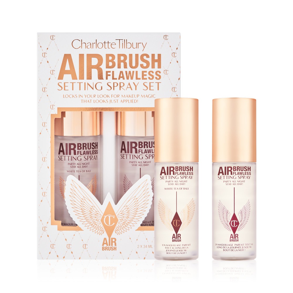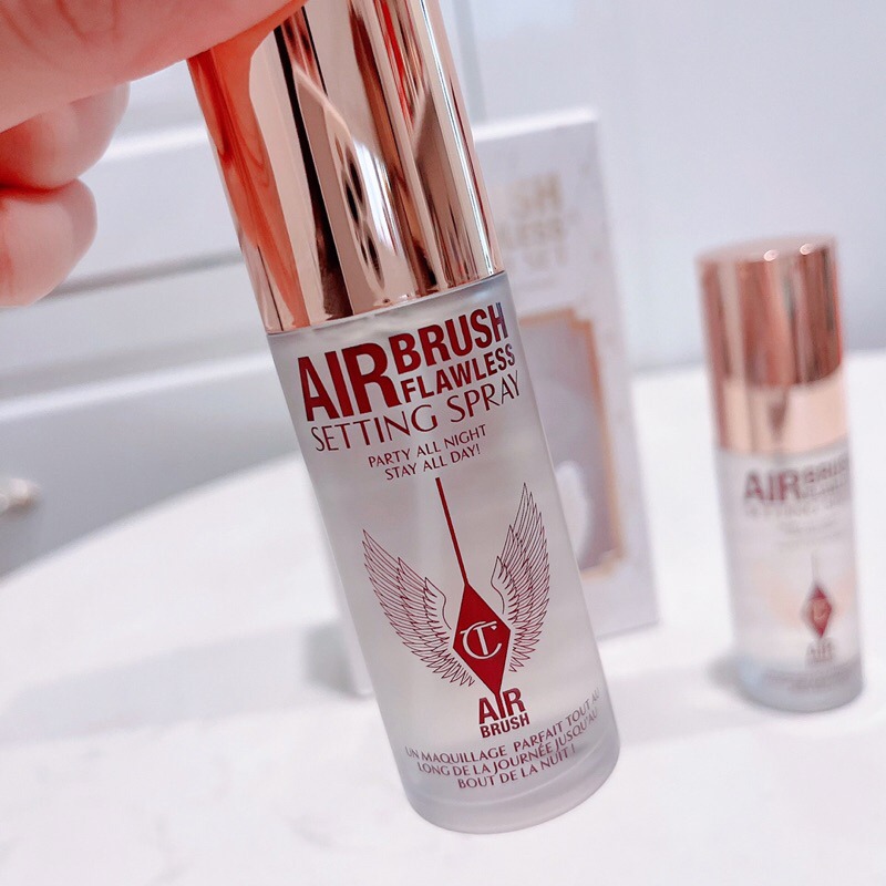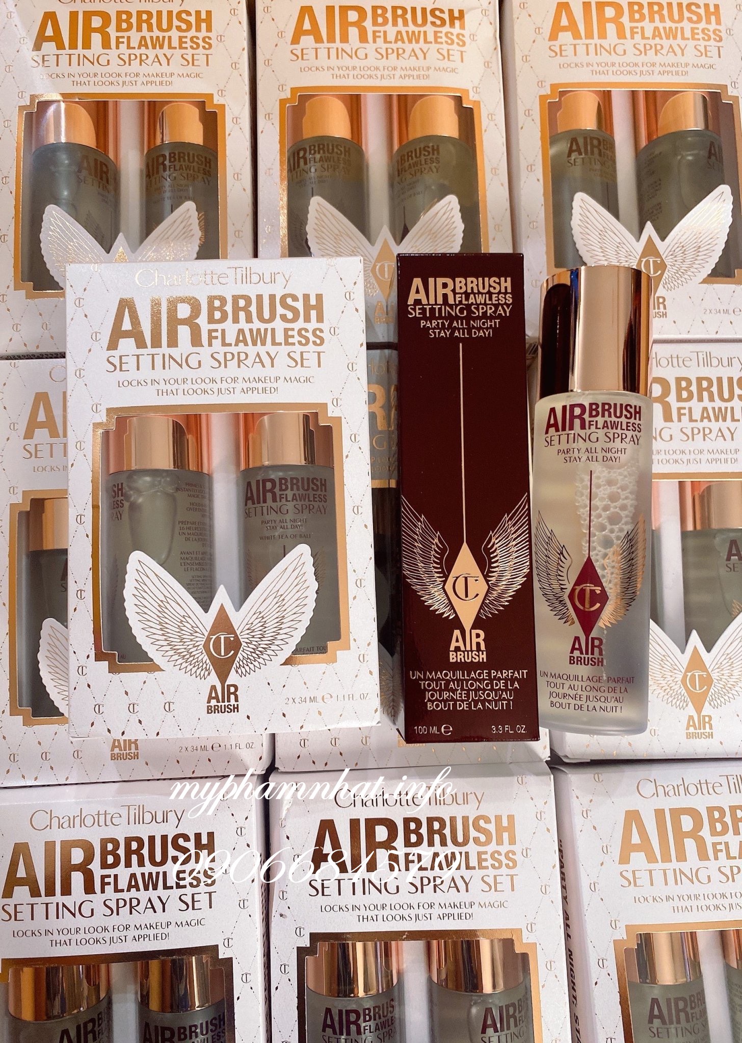 - Charlotte Tilbury Airbrush Flawless Setting Spray có công thức hiệu quả cao kết hợp hài hòa với kem nền, kem che khuyết điểm, phấn phủ và phấn phủ để tạo ra một bức màn dưỡng ẩm không trọng lượng và một lớp nền hoàn mỹ .