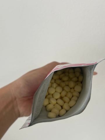 Sản phẩm được đựng trong túi zip màu trắng – hồng dễ thương, tiện lợi để bảo quản và tránh ánh nắng. Thông tin sản phẩm in rõ ràng, tuy toàn bộ bằng tiếng Nhật nhưng vẫn dễ tra cứu. Hạn sử dụng in ở góc dưới mặt sau túi, ví dụ “25.09” nghĩa là hết hạn vào tháng 09 năm 2025.